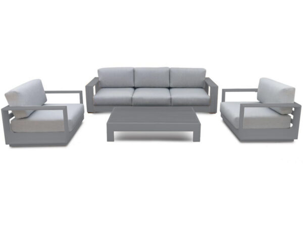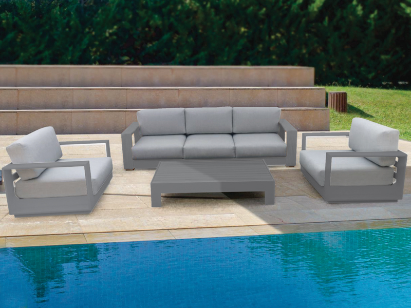 A: 1 Sillón Sorrento color grafito (3 cuerpos) B: 2 Sillones Sorrento color grafito (1 cuerpo), C: 1 Mesa de caffee Sorrento color grafito