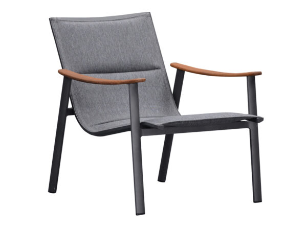 Estructura de aluminio en color grafito, tela textilene gris, apoyabrazos de teka.